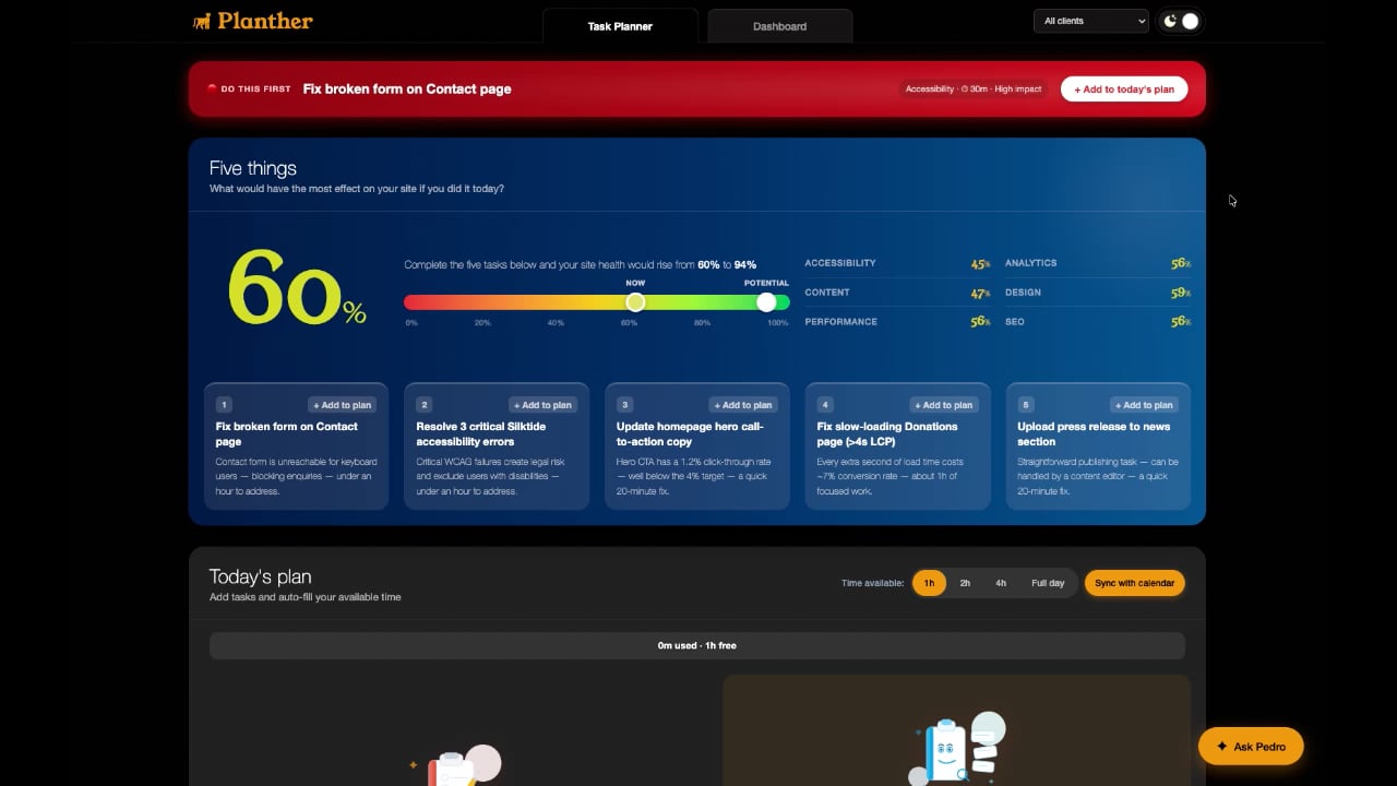 The task planner lets you act on that. Instantly, it shows you the five things that would have the most effect on your site if you did them today and tells you how much your site health would improve as a result. You set how much time you have available for the day and the tool builds a plan around it, drawing tasks from real data sources, categorising them by type (content, accessibility, performance, analytics), and ranking them using an Eisenhower matrix so you can see what’s urgent, what’s important, and what can wait. There’s also a built-in AI assistant who can help you think through your workload and figure out where to start.